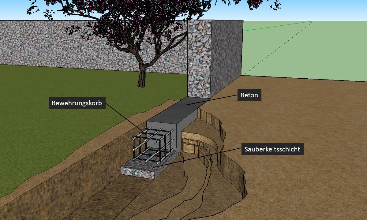 - Breite: 40–50 cm, abhängig von der Mauerstärke. Für Pfeiler empfiehlt sich eine noch breitere Fundamentfläche.